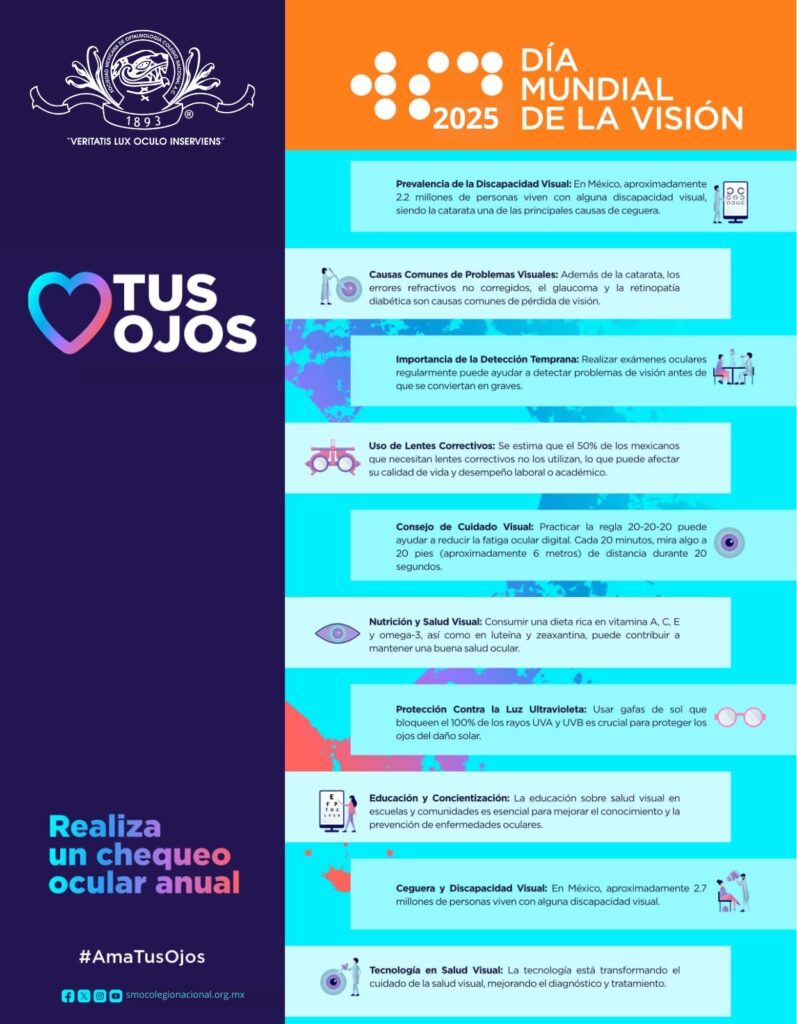 Ciudad de México, 8 de octubre de 2025.- Cada año, el Día Mundial de la Visión se celebra el segundo jueves del mes de octubre y nos recuerda la importancia de cuidar uno de los sentidos más valiosos del ser humano: la visión. En México, donde millones de personas viven con padecimientos visuales prevenibles, la Sociedad Mexicana de Oftalmología Colegio Nacional hace un llamado a la población a realizar revisiones oftalmológicas periódicas como la mejor herramienta para preservar la salud ocular.