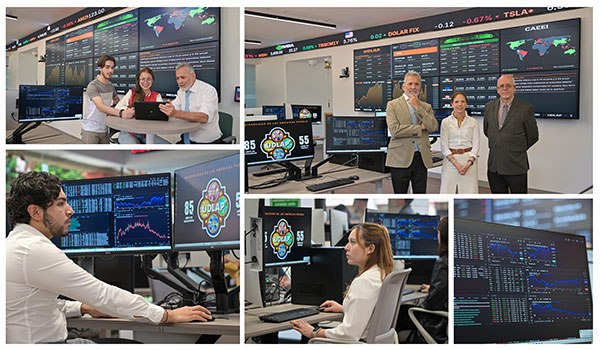 “A qué referimos cuando decimos que es un centro financiero universitario de realidad inmersiva, es que en éste los jóvenes viven una experiencia 100% dentro del mercado financiero. Un espacio donde los estudiantes pueden operar y diseñar estrategias de inversión, con equipo de tecnología de punta como el video wall, de seis metros de largo por dos metros de alto con ocho pantallas, y un ticker de 14 metros de largo con pantallas de led semicirculares. Y ahí, toda la información sobre divisas, el mercado de índices bursátiles, noticias financieras, sobre precios de productos, acciones que están en el mercado bursátil mexicano, acciones locales y las 3 mil 500 que cotizan en el sistema internacional de cotizaciones, están en tiempo real”.