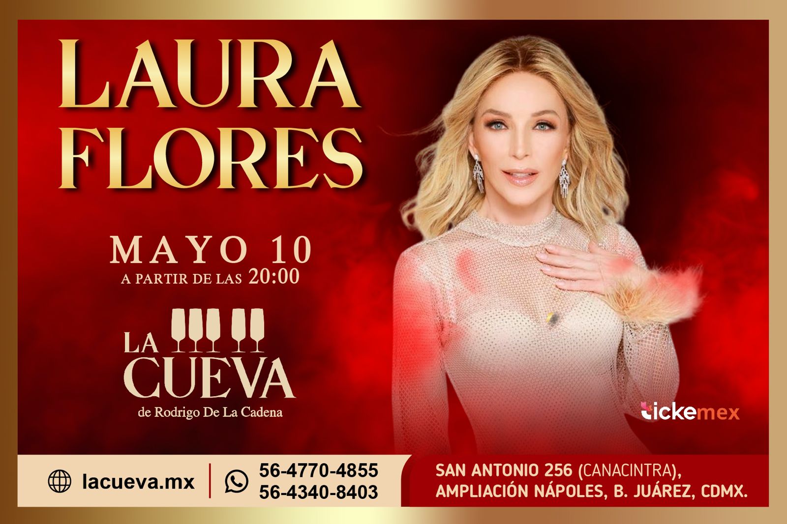 *Laura Flores se presenta el próximo 10 de Mayo de 2025 en La Cueva de Rodrigo de la Cadena situada en Avenida San Antonio 256, Nonoalco, Benito Juárez