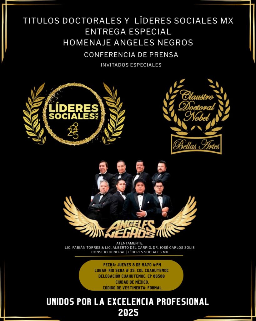 Con la entrega de este Doctorado Honoris Causa, Líderes Sociales Mx y el Claustro Doctoral Nobel Bellas Artes colocan el nombre de Los Ángeles Negros en el plano académico y cultural más alto, consolidando así a la agrupación como un referente no sólo de la música, sino de la historia viva del arte latinoamericano.