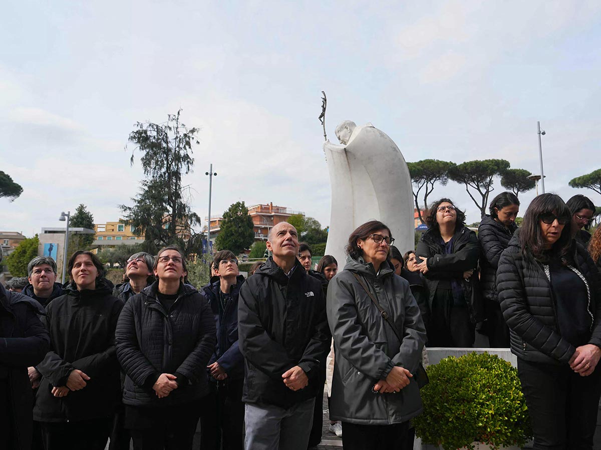 Unos 30 miembros de la congregación Ragazzi dell’Immacolata de Roma rezan un rosario, mientras que un numeroso grupo de jóvenes de clubes católicos cercanos a Milán, en el norte de Italia, se instalan por el suelo para rezar el Ángelus.