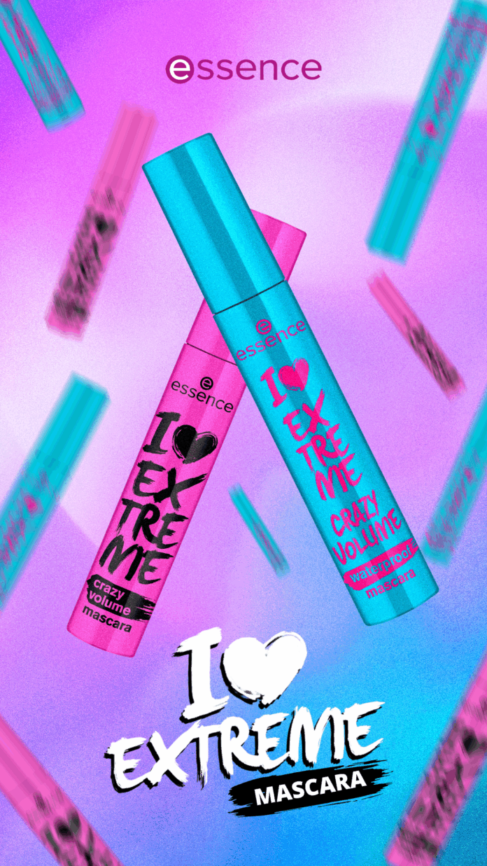 essence presenta I Love Extreme Crazy Volume Mascara y I Love Extreme Mascara Waterproof para quienes buscan potenciar su mirada con volumen y durabilidad. Estas máscaras llegan para transformar la mirada de las mexicanas con fórmulas innovadoras que no solo aportan longitud y volumen extremos, sino que también cuidan y protegen las pestañas, ojos y piel.